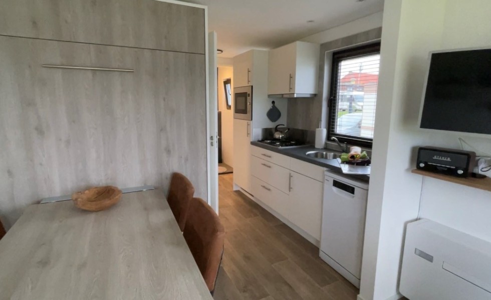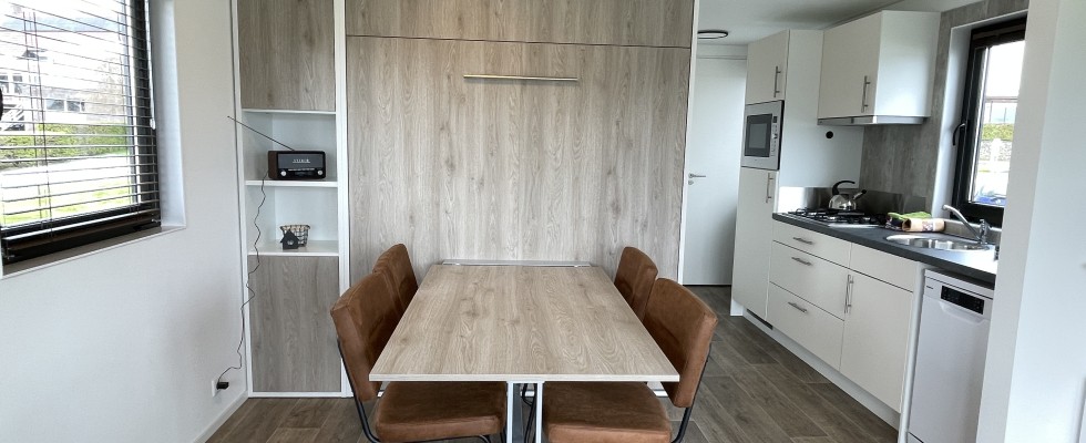 - 2e Slaapplek: Een bedkast in de woonkamer, met een eettafel die onder het bed verdwijnt wanneer het bed wordt neergelaten. Dit is een slimme ruimtebesparende oplossing.